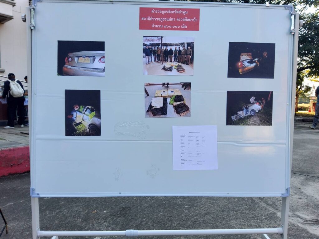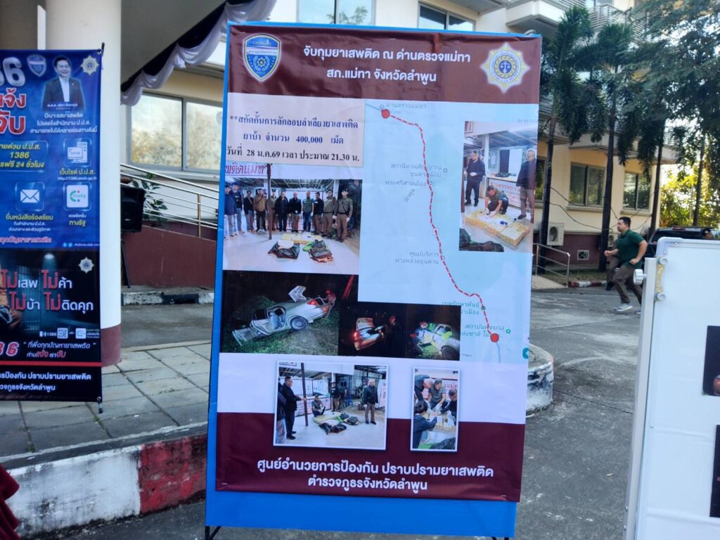2.) สถานีตำรวจภูธรแม่ทา ตรวจยึดยาเสพติดของกลาง(ยาบ้า) จำนวน 400,000 เม็ด
