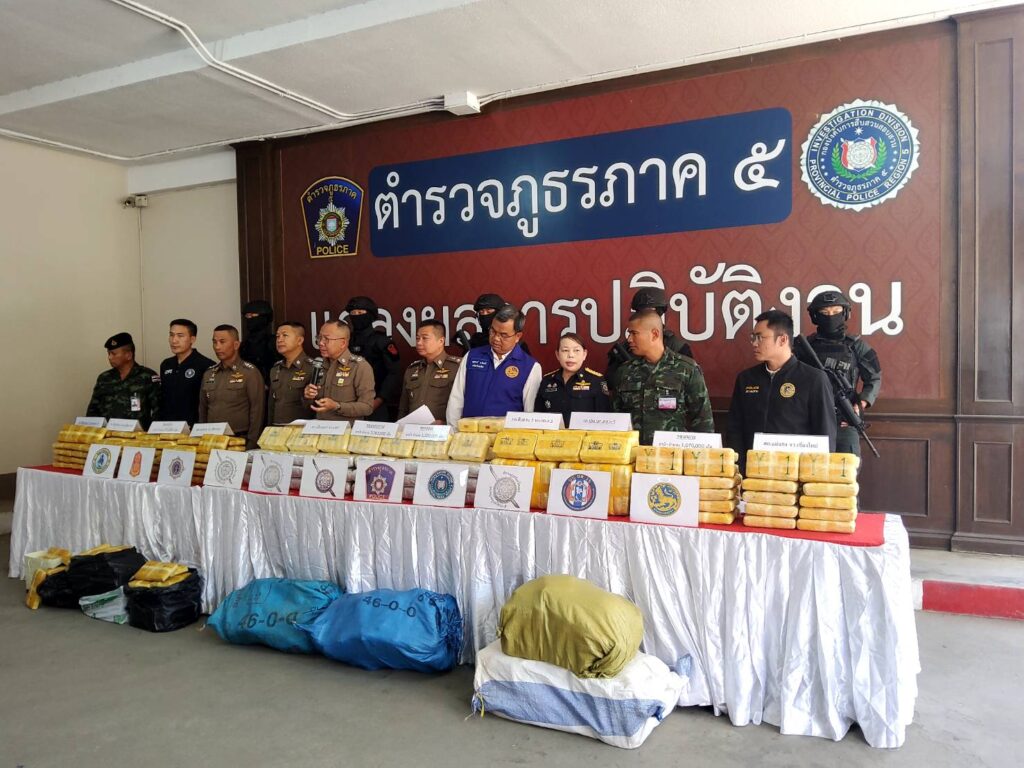 เชียงใหม่ – ตำรวจภูธรภาค 5 พร้อมด้วยผู้แทนกระทรวงมหาดไทย กระทรวงยุติธรรม กระทรวงกลาโหม แถลงผลการจับกุมเครือข่ายยาเสพติดรายใหญ่ 3 คดีซ้อนในพื้นที่เชียงราย แพร่ และ จังหวัดเชียงใหม่