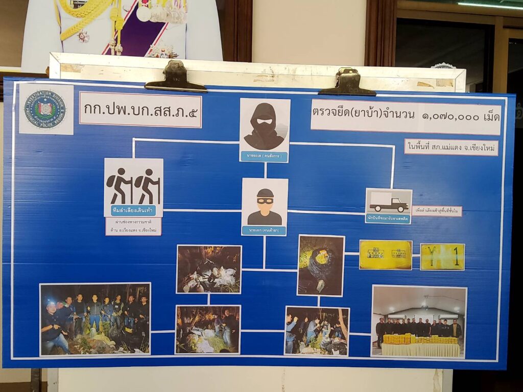 ในวันเดียวกัน ช่วงเวลาประมาณ 22 นาฬิกา 30 นาที ชุดปฏิบัติการพิเศษ กองบังคับการสืบสวนสอบสวน ตำรวจภูธรภาค 5(บก.สส.ภ.5)ได้สนธิกำลังกับ สถานีตำรวจภูธรแม่แตง จังหวัดเชียงใหม่ ลงพื้นที่ตรวจสอบบริเวณบ่อขยะในหมู่บ้านหนองโค้ง หลังได้รับแจ้งว่าจะมีการส่งมอบยาเสพติดโดยใช้แผ่นโฟมสีขาวเป็นสัญลักษณ์ทิ้งไว้ริมทาง จากการเข้าตรวจสอบจุดดังกล่าว พบถุงพลาสติกสีดำจำนวน 5 ถุง ภายในบรรจุยาบ้าถึง 1,070,000 เม็ด แม้คดีนี้จะไม่พบตัวผู้ต้องหาในจุดเกิดเหตุ แต่เจ้าหน้าที่ได้เร่งรวบรวมพยานหลักฐานเพื่อขยายผลออกหมายจับขบวนการที่อยู่เบื้องหลังต่อไป