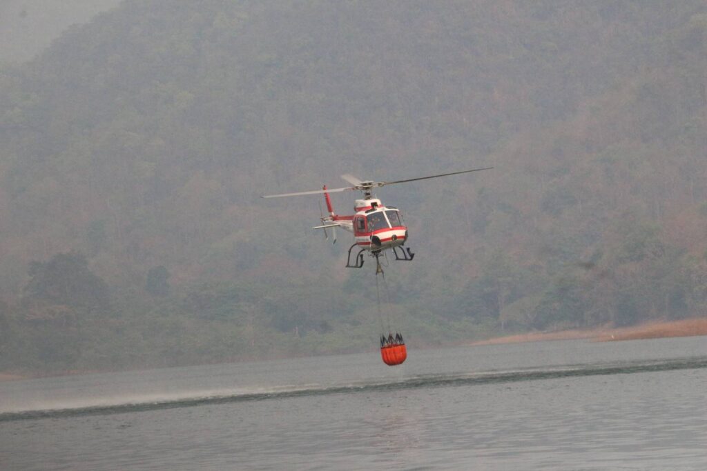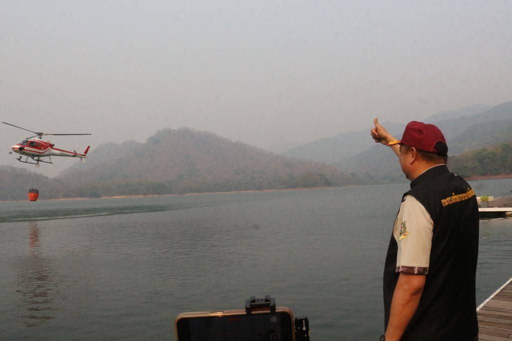 โดย รองนายกรัฐมนตรีฯ พร้อมคณะ ได้นั่งเรือล่องเข้าไปยังเกาะกลางน้ำซึ่งอยู่ใจกลางของเขื่อนแม่งัดสมบูรณ์ชล เพื่อสำรวจสภาพพื้นที่ป่าในปัจจุบันของอุทยานแห่งชาติศรีลานนา พร้อมทั้งเยี่ยมชมปฏิบัติการดับไฟป่า ซึ่งได้มีการนำเฮลิคอปเตอร์ที่ได้รับการสนับสนุนจากกระทรวงทรัพยากรธรรมชาติและสิ่งแวดล้อม ตักน้ำในปริมาณครั้งละ 500 ลิตร จากเขื่อนแม่งัดฯ ขึ้นไปช่วยดับไฟในจุดพื้นที่ภูเขาสูงชันและเข้าถึงได้ยาก ควบคู่กับการดับไฟของกำลังพลภาคพื้นดินที่คอยควบคุมสถานการณ์อยู่ในจุดที่ยังพอเข้าถึงได้