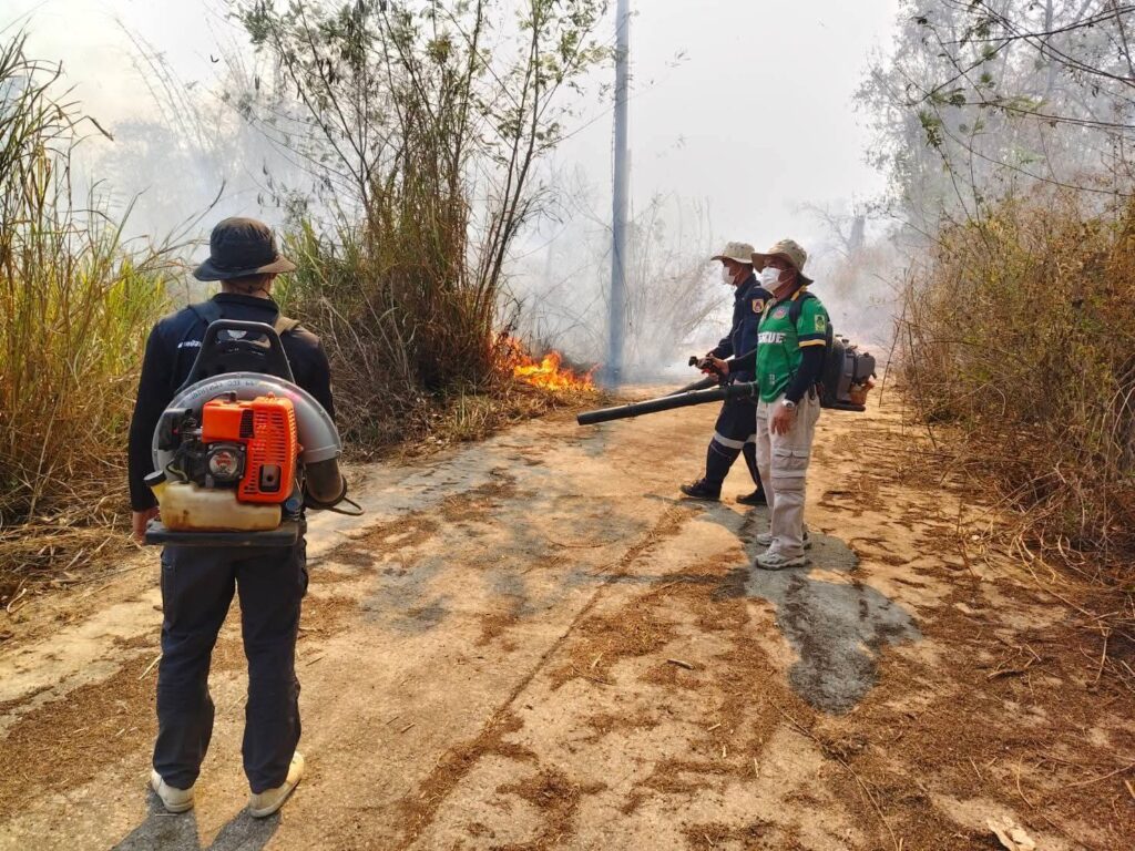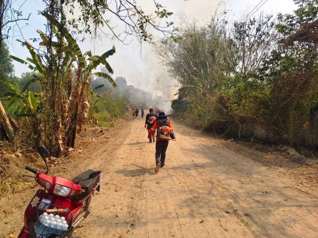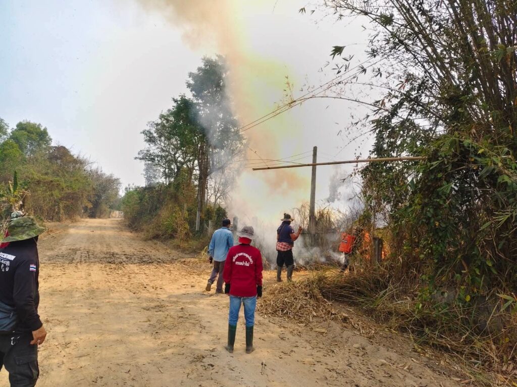 เชียงราย-เทศบาลเวียงกาหลง ร่วมกับผู้นำหมู่บ้าน ลงพื้นที่ดับไฟป่าในพื้นที่