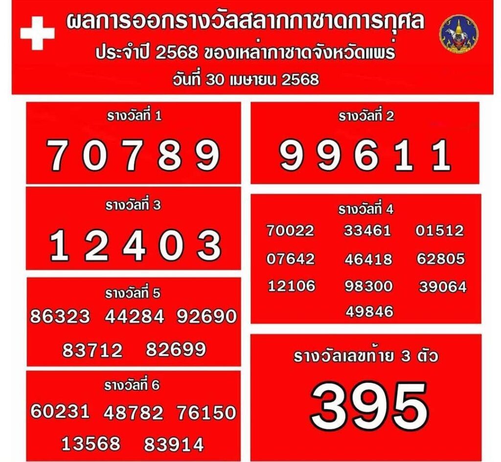 เมื่อเวลา 09.00 น.วันที่ 30 เมษายน 2568 ที่บริเวณกาดสามวัย เทศบาลเมืองแพร่ นายสมชัย เลิศประสิทธิพันธ์ ผู้ว่าราชการจังหวัดแพร่ พร้อมด้วยนางสาวฐิติมา สุภาพันธ์ นายกเหล่ากาชาดจังหวัดแพร่ นายคุณากร คชหิรัญ , นายชัยสิทธิ์ ชัยสัมฤทธิ์ผล รองผู้ว่าราชการจังหวัดแพร่ คณะกรรมการเหล่ากาชาดจังหวัดแพร่ และคณะกรรมการออกรางวัลสลากกาชาดการกุศลของเหล่ากาชาดจังหวัดแพร่ ประจำปี 2568 ได้ดำเนินการหมุนวงล้อออกรางวัลจำนวนทั้งสิ้น 6 รางวัล ดังนี้
