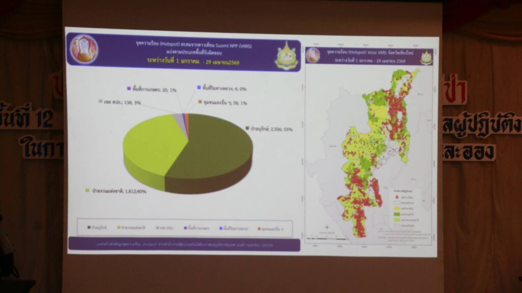 สถานการณ์ด้านจุดความร้อนลดลงจากปี 2567 จำนวน 13,858 จุด คิดเป็นร้อยละ 19.54 แต่ยังมี 9 จังหวัดที่แนวโน้มเพิ่มขึ้น โดยเฉพาะแม่ฮ่องสอน ตาก และอุตรดิตถ์ โดยจุดความร้อนที่พบรวม 57,079 จุด ส่วนใหญ่เกิดในพื้นที่ป่าอนุรักษ์ 24,107 จุด และป่าสงวนแห่งชาติ 22,581 จุด ซึ่งยังสูงกว่าที่ตั้งเป้าไว้ว่าในพื้นที่ป่าจะลดลงให้ได้ร้อยละ 25 ขณะที่พื้นที่เกษตร เช่น นาข้าว ข้าวโพด และอ้อย ต้องลดลงร้อยละ 30 โดยพบว่าพื้นที่ป่าและนาข้าวยังคงมีแนวโน้มเพิ่มขึ้นอย่างมีนัยสำคัญ