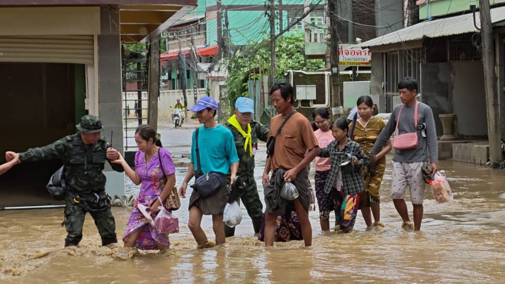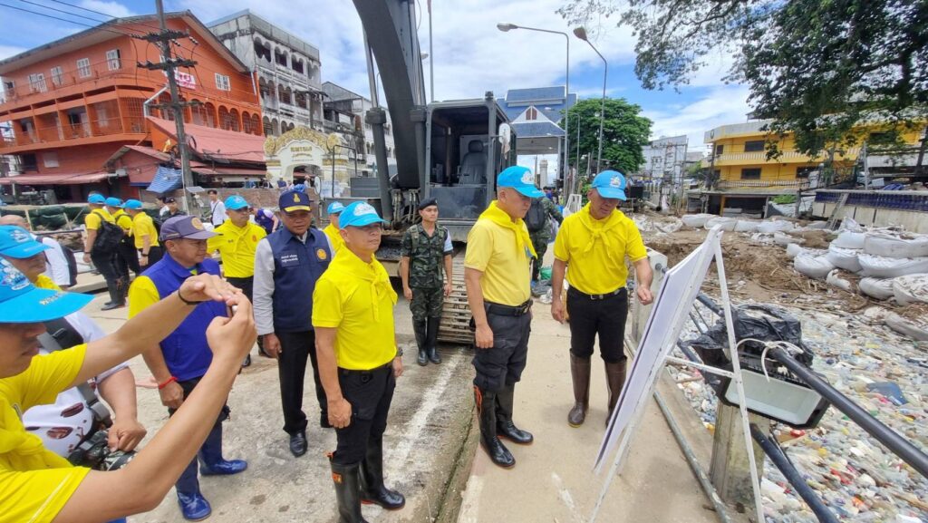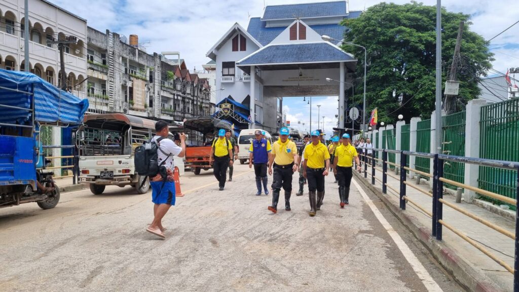 โดย จุดแรก แม่ทัพภาคที่ 3 ผู้อำนวยการศูนย์อำนวยการจิตอาสาพระราชทานภาค 3 ได้รับฟังรายงานสถานการณ์น้ำและแนวทางการป้องกัน จาก นายอำเภอแม่สาย และ พลโท สิรภพ ศุภวานิช เจ้ากรมการทหารช่าง ถึงแผนงานในการรับมือกับน้ำท่วม และปัญหาที่เกิดขึ้นโดยพบว่า พนังกั้นแม่น้ำสาย ที่ก่อโดยบิ๊กแบ็คและ ผนังของอาคารที่ทำการเชื่อมจุดปิดรูรั่วต่างๆเพื่อป้องกันน้ำท่วม ในช่วงวันที่ 28 กรกฎาคม 2568 ที่ผ่านมา พบว่ามีการ รั่ว ทะลัก หลายจุดซึ่งส่วนใหญ่เกิดจากโพรงใต้อาคารและท่อนซุงขนาดใหญ่กระทุ้งทำให้ผนังของอาคารที่เป็นแนวกั้นน้ำทะลุ จนเป็นช่องทางให้น้ำเข้าท่วมในพื้นที่ อำเภอแม่สาย หลายชุมชน ซึ่ง กรมการทหารช่าง ร่วมกับกำลังทหารในพื้นที่ได้เร่งซ่อมแซม จุดดังกล่าว