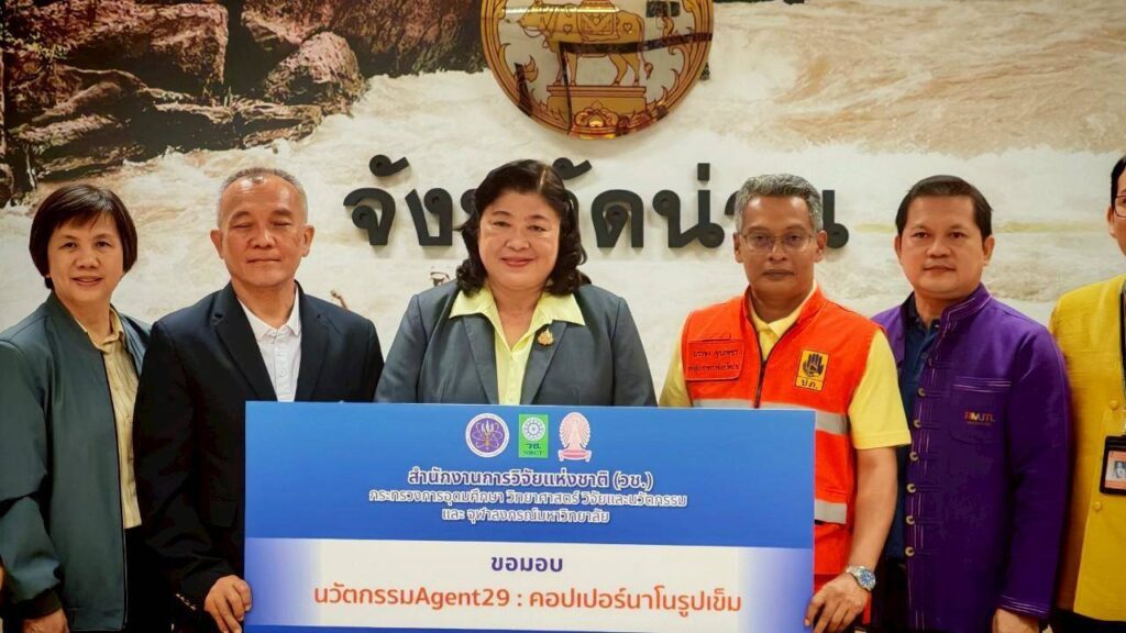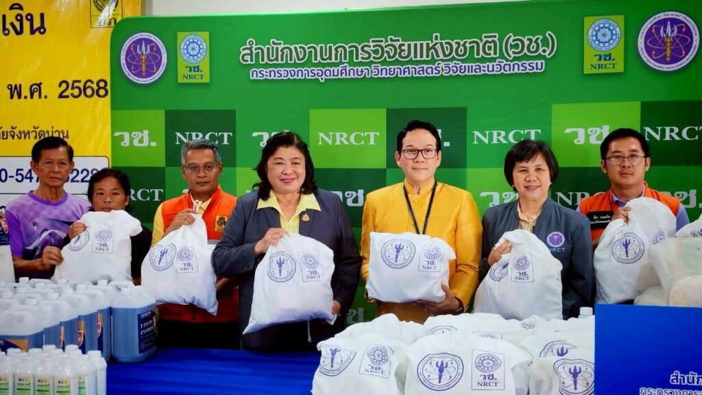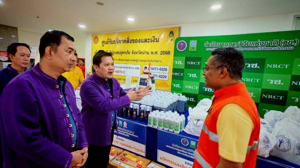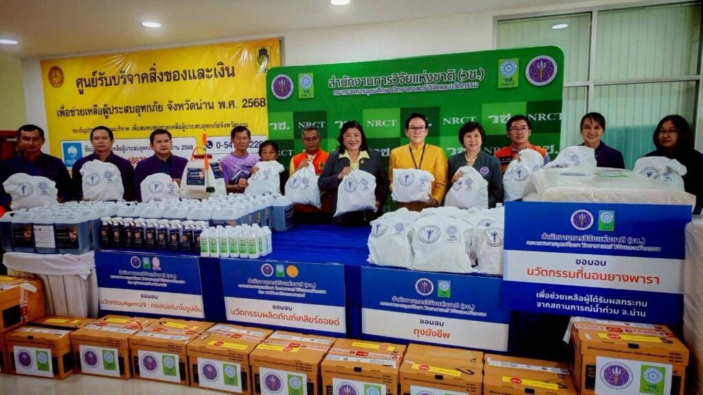 อุปกรณ์ และผลิตภัณฑ์นวัตกรรมจากงานวิจัย แก่ผู้ประสบภัยน้ำท่วมในจังหวัดน่านที่รับมอบในครั้งนี้ เป็น ผลงานวิจัยของ ศาสตราจารย์ดร.สนอง เอกสิทธิ์ ภาควิชาเคมี คณะวิทยาศาสตร์ จุฬาลงกรณ์มหาวิทยาลัย ผลงาน “Agent29: คอปเปอร์นาโนรูปเข็ม “ เพื่อป้องกันเชื้อราหลังน้ำท่วม สำหรับปูนซีเมนต์ ไม้ ฝาเพดาน พรม ผ้า ฟองน้ำ และรถยนต์ พร้อมทั้งรับบมอบถุงยังชีพและที่นอนยางพารา เพื่อ นำไปมอบให้กับพี่น้องประชาชนที่ประสบอุทกภัยในจังหวัดน่านต่อไป