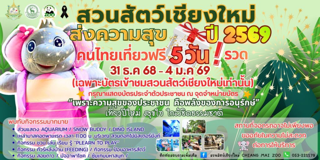 สวนสัตว์เชียงใหม่ ขานรับนโยบายกระทรวงทรัพยากรธรรมชาติและสิ่งแวดล้อม มอบของขวัญพิเศษส่งท้ายปีเก่า ต้อนรับปีใหม่ พ.ศ. 2569 ประกาศยกเว้นค่าธรรมเนียมเข้าชมสำหรับคนไทย 5 วันเต็ม (31 ธ.ค. 68 – 4 ม.ค. 69) ภายใต้แนวคิด “เพราะความสุขของประชาชน คือพลังของการอนุรักษ์” พร้อมจัดกิจกรรมพิเศษรองรับนักท่องเที่ยวทุกวัยนโยบายจากกระทรวงทรัพยากรธรรมชาติและสิ่งแวดล้อม