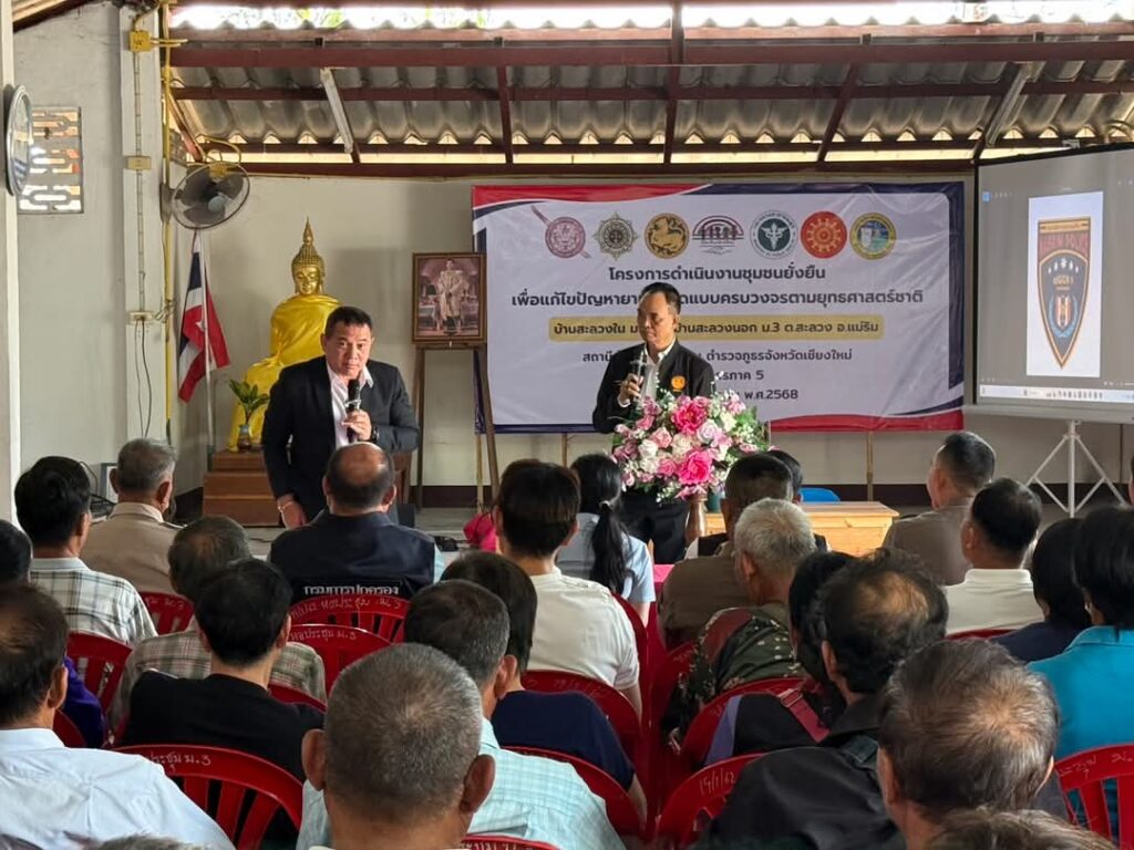 วันที่ 29 มี.ค.2568 เวลา 09.30 น.คณะกรรมาธิการการกฎหมาย และยุติธรรม วุฒิสภา นำโดย พล.ต.ท.บุญจันทร์ นวลสาย ประธานคณะกรรมาธิการ นายสากล ภูลศิริกุล รองประธานคณะกรรมาธิการ,นายเศก จุลเกษร รองประธานคณะกรรมาธิการ พร้อมคณะ ได้เดินทางมาศึกษาดูงานในประเด็นเกี่ยวกับรายงานผลการปฏิบัติโครงการตำบลยั่งยืน เพื่อแก้ไขปัญหายาเสพติดแบบครบวงจร ตามยุทธศาสตร์ชาติ บ้านสะลวงใน ม.2 และบ้านสะลวงนอก ม.3 ต.สะลวง โดยมี พล.ต.ต.ธนะรัชต์ ชุ่มสวัสดิ์ รอง ผบช.ภ.5,พ.ต.อ.กิตติพงษ์ เพ็ชรมุณี รอง ผบก.ภ.จว.เชียงใหม่,พ.ต.อ.สิทธา คำเลิศ ผกก.สภ.แม่ริมฯ,พ.ต.ท.นำพล พรหมการัตน์,พ.ต.ท.สมชัย บริบูรณ์ สวป.สภ.แม่ริมฯ,พ.ต.ต.วุฒิไกร สมใจ สวป(ชส.)สภ.แม่ริม ชุดปฏิบัติการชุมชนยั่งยืน พร้อมหัวหน้าส่วนราชการ อบต.สะลวง,สาธารณสุขอำเภอแม่ริม,รพ.สต.บ้านสะลวงนอก ผอ.สถานศึกษา,กำนันตำบลสะลวง ผู้ใหญ่บ้านและคณะกรรมการหมู่บ้าน บ้าานสะลวงใน บ้านสะลวงนอก ให้กับต้อนรับและรับฟังคำแนะนำการดำเนินงานตามโครงการตำบลยั่งยืน ในครั้งนี้