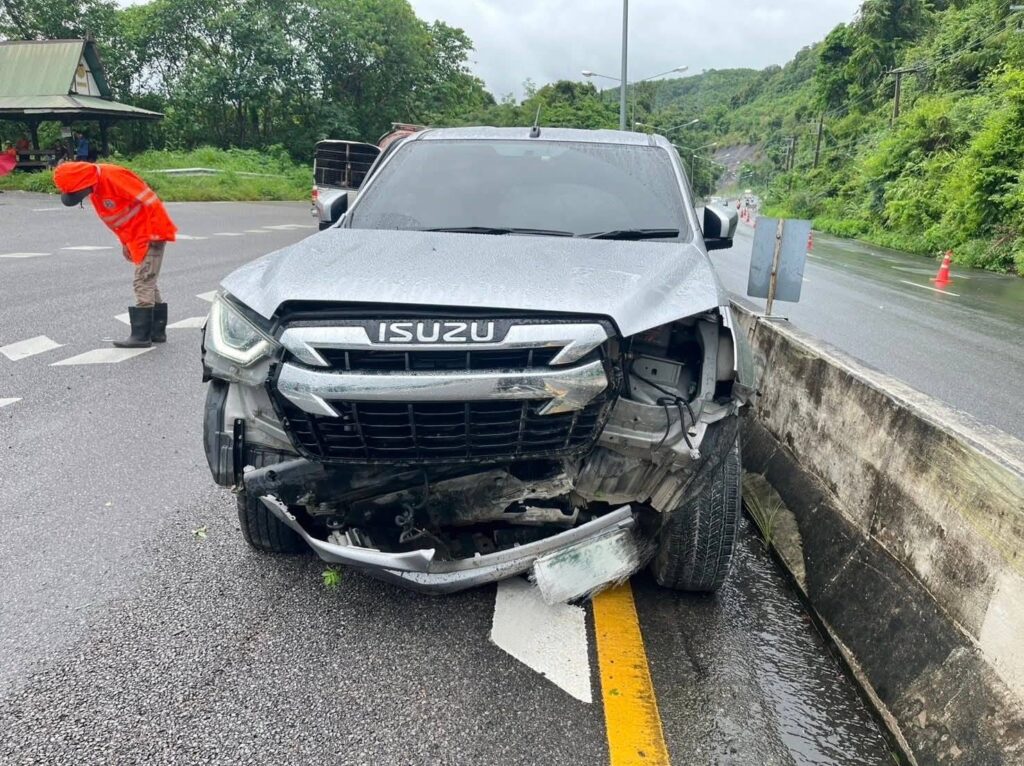แพร่-อีกแล้ว ฝนตกถนนลื่น!!! รถยนต์กระบะเสียหลัก ชนแบริเออร์ ทางเข้าบ้านเขาพลึง ต.ห้วยไร่ อ.เด่นชัย จ.แพร่
