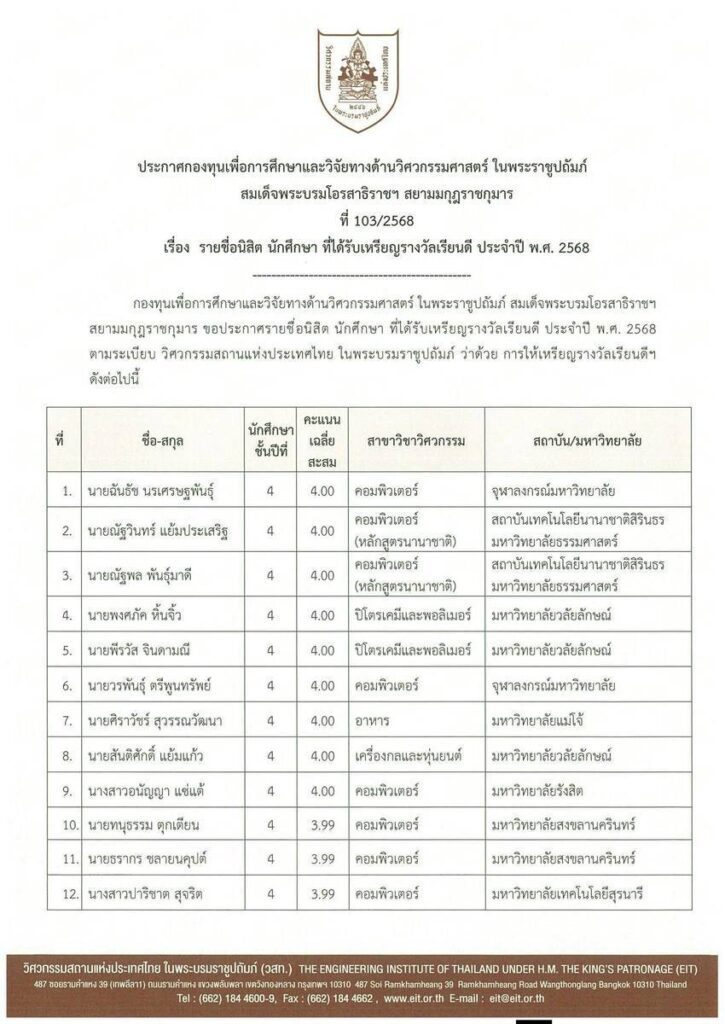 พระบาทสมเด็จพระเจ้าอยู่หัว ทรงพระกรุณาโปรดเกล้าโปรดกระหม่อมให้ พลเอก ดาว์พงษ์ รัตนสุวรรณ องคมนตรี เป็นผู้แทนพระองค์ ออกรับ คณะกรรมการอำนวยการวิศวกรรมสถานแห่งประเทศไทย ในพระบรมราชูปถัมภ์ และคณะกรรมการบริหารกองทุนเพื่อการศึกษาและวิจัยทางด้านวิศวกรรมศาสตร์ฯ นำโดย รองศาสตราจารย์ ดร.วัชรินทร์ กาสลัก นายกวิศวกรรมสถานแห่งประเทศไทยฯ นำนิสิต นักศึกษา คณะวิศวกรรมศาสตร์ ที่มีผลการเรียนดีเด่น มีเกรดเฉลี่ยสะสมไม่ต่ำกว่า 3.60 ขึ้นไป ประจำปี 2568 จากสถาบันอุดมศึกษาทั่วประเทศ ที่ผ่านการคัดเลือก จำนวน 54 คน เข้ารับเหรียญรางวัลเรียนดีของกองทุนเพื่อการศึกษาและวิจัยทางด้านวิศวกรรมศาสตร์ ในพระราชูปถัมภ์ สมเด็จพระบรมโอรสาธิราช ฯ สยามมกุฏราชกุมาร